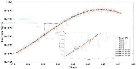 Since the GPS data will also have errors, we removed the IA data statistics and added the error reduction rate (ERR) compared with low precision sensors. Table 5 shows that the data fusion effect of five sensors was the best; the fusion effect of two sensors was almost the same but in MAPE. This phenomenon occurs mainly because a high-precision filtered data is directly used as the final fusion result in the fusion process of two sensors, while ignoring the impact of low-precision sensors. It will lead to the stability of the overall effect. However, the deviation degree of the error was still the largest in data fusion of two sensors from RMSE and MAE. Table 5 also shows that the fusion effect also improved with the increase of the number of sensors and the increase of the number of low-precision sensors had no impact on the fusion results. This case illustrates the LSTM-GWFA algorithm only suppressed the low-precision measured values, but not a certain sensor, which gives the method generalization ability.
