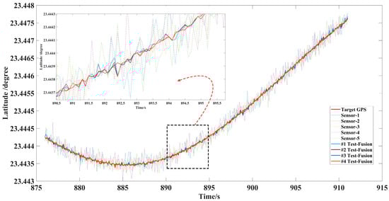 In the off-site flight test, we could not obtain the real position information of the aircraft in the ideal environment directly, but we used the high-precision data of GPS as the standard value of the real position, and the detection data using longitude, latitude, and altitude as the comparison parameters of the data fusion components refer to practical application in air.
