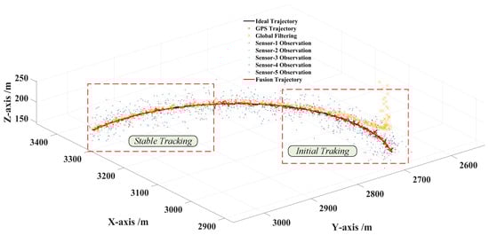 Figure 11 shows the fusion trajectory results of five sensors and that the deviation of the global Kalman filter results is very large when data fusion of tracking is started, especially in maneuvering. However, with the correction of the fusion results, the deviation can be quickly corrected. In the process, the result of global filtering also reverses the fusion accuracy, making the prediction results of LSTM more accurate. After a period of time, the multisensor fusion results show stable tracking of the trajectory, which proves the effectiveness of the method and has certain universality for the conventional motion model.