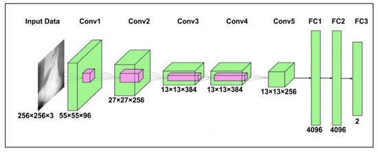 The AlexNet [35] model contains three dense layers and five convolutional layers. The first step is to scale the bone image to 256 × 256 pixels, corresponding to width and height, and a three-color channel that represents the depth of the image. The output of neurons is calculated using their respective weights as the inner product of a small portion of the image. First convolution layer (Conv1) size is fixed to 96 and a filter of size 11 × 11 with steps of four is added. After that, the output of the first convolutional layer is fed to the second convolution layer (Conv2) of 256 and filter of size 5 × 5. The third (Conv3) and fourth layers (Conv4) have 384 kernels with filters of 3 × 3. Finally, the last convolutional layers have a kernel of 256 and a filter of size 3 × 3. A m-pooling of 2 × 2 is applied after each convolution layer. The FC1 and FC2 are the fully connected layer search with 4096 neurons. The FC3 uses the Softmax function to classify bone into healthy and fracture. The detailed architecture of the AlexNet for bone diagnosis is shown in Figure 1.