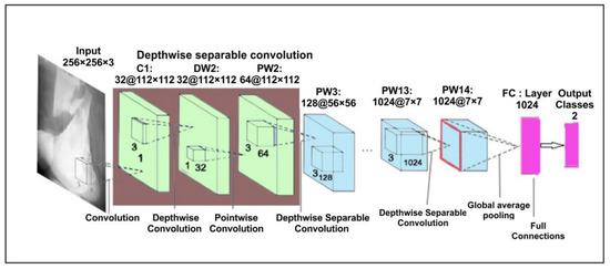 In the proposed approach, we have used pre-trained MobileNetV2 [36] architecture trained on ImageNet. This model is a lightweight network and the significant aim is to minimize the parameters so that the computation is done quickly. To minimize the parameters, it uses a separate layer of convolution. In addition, MobileNetV2 uses depth-wise separable convolutions that are supportable in a very effective manner for a smartphone [37]. A depth-separable convolution layer is the combination of a point convolution layer and a deep convolution layer. At each input path, the deep convolution layer performs a single convolution. After that, the point convolution layer compares the output of the deep convolution layer. It works on a new communication mode that would link each of the current network layers to the previous network layers; with fewer convolution kernels, it can use the previous features repeatedly to create more feature maps. The basic structure has a growth rate of four with four tightly connected layers. Each layer considers input from its previous layer’s output in the form of a feature map in this system. The architecture of the MobileNetV2 is shown in Figure 2.