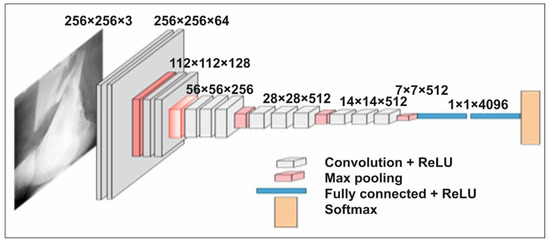 The network VGG16 [39] is considered one of the superior architectures of the vision model to date. The strangest thing about VGG16 is that it replaces the huge number of hyper parameters. The VGG16 network is 16 layers deep and has a kernel of size 3 × 3. In addition to this, five layers of this model have max-pooling layers of 2 × 2. After the last max-pooling layer, it has three dense layers, one fully connected layer and Softmax as a classifier layer. The architecture of the VGG16 for the proposed bone diagnosis is shown in Figure 4.