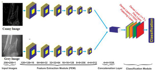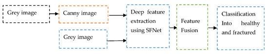 The modified canny edge detection algorithm is able to extract the fractured region. The canny image along with the grey image used for training of the model has produced significant improvement in the classification accuracy. The noise can affect the performance of the deep CNN model. Hence, to obtain a highly robust model, noise effect should be minimized. The improved canny edge algorithm can suppress the noise and produce fine edges of the bone image. That helps the proposed model to learn more accurate features from bone images. Proposed method is depicted in Figure 7.