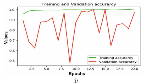 The accuracy and loss of training and validation for each model is calculated to measure the performance. In Figure 8a,b we can observe that for the AlexNet, training loss is very small, whereas the testing loss is increasing; also training accuracy is close to 99% after 10 epochs and testing accuracy decreases after 15 epochs and reaches 90%. A similar pattern can be observed in Figure 8c,d of the VGG16 model. The training loss is very close to 0 and testing loss increases after 10 epochs to reach 1.2. The training accuracy reached 99% and testing accuracy remain close to 94% after 10 epochs. The ResNeXt model loss and accuracy are shown in Figure 8e,f, respectively. The validation and training loss is nearby 0 after 8 epochs and training accuracy reaches 100%, whereas testing accuracy reached 95%. Furthermore, MobileNetV2 trained on ImageNet is implemented for bone diagnosis. In Figure 8g, the training and validation loss of the transfer learning-based approach is depicted. We can observe that the training loss is close to 0, whereas the testing loss increases and reaches 1.2. In addition, the accuracy of training and validation is shown in Figure 8h; the training accuracy reached 99% after 10 epochs and testing accuracy decreases from 70% to 52%. Finally, in Figure 8i,j we can see, using the proposed multi-scale deep learning model, the training and testing loss reached very close to 0, and accuracy reached more than 99%.