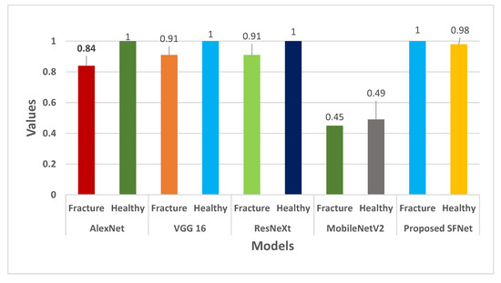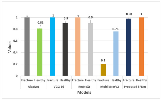 In Figure 11, the recall value of each model is plotted. The recall value of AlexNet, VGG16 and ResNeXt for fractured bone is 100%. Whereas, Hybrid SFNet achieved 98% and MobileNetV2 obtained 20% recall values. For healthy bone, hybrid SFNet has 100% recall value and other models reached 90%, except MobileNetV2.