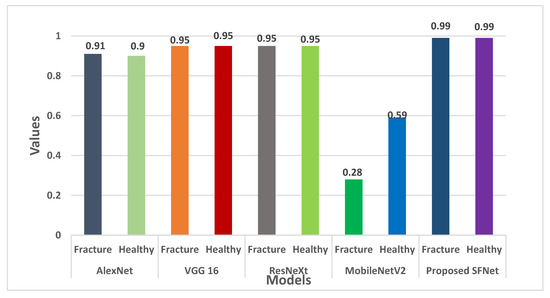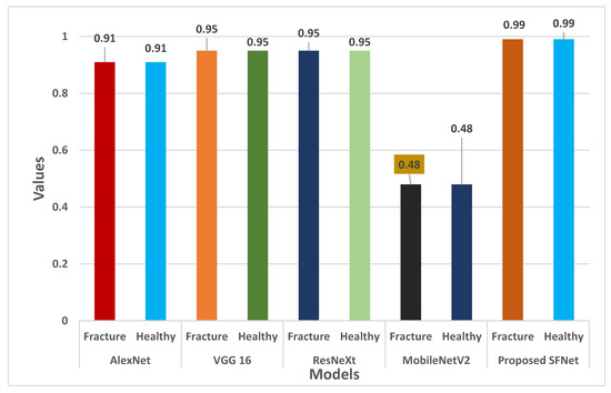 The performance measures precision for each model is shown in Figure 10. In Figure 10, it can be noticed that the highest precision value of 100% for fractured bone is obtained by the hybrid SFNet. The VGG16 and ResNeXt have a similar value of 91%. Whereas, AlexNet showed 84% and the least value of 45% is yielded by the pre-trained MobileNetV2.