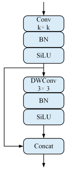 - The CBS basic convolution block is replaced with Ghostconv. Ordinary convolution brings numerous parameters, and the introduction of the Ghost module can greatly reduce the total number of model parameters. According to the Ghost module, for input to obtain the dimension feature maps, the normal convolution is used to generate the inherent feature maps of the m-dimension, and then, the linear transformations of the inherent feature maps of the m-dimension are performed to generate the dimension feature maps. Finally, the two parts of the feature maps are stacked to obtain the results. Therefore, the number of common convolution parameters is about times that of the Ghost module. In this paper, it is assumed that the number of output channels are , the dimensions of the inherent feature graph are , and the BN term and bias term are simplified. Therefore, the acceleration ratio is about 2, and the number of parameters of GhostConv is only about half of CBS.