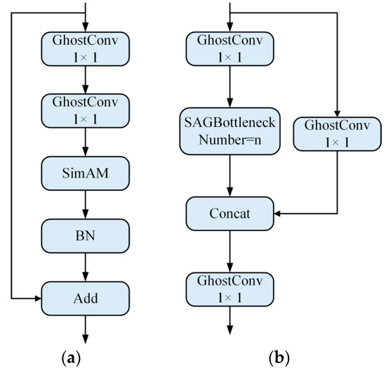 - The SimAM attention mechanism is introduced, and SAGBottleneck is designed as the basic structure of SAG-YOLOv5s. To better suppress the complex background and focus on drone targets during feature extraction, the SimAM attention module and the Ghost module are integrated and embedded into the Bottleneck structure of YOLOv5s. The SAGBottleneck structure is shown in Figure 6a. This structure is similar to the residual structure, mainly including two 1 × 1 Ghostconv modules and a skip connection. The first Ghostconv is used to reduce the number of input channels, thereby reducing the feature dimension. The SimAM attention mechanism is embedded in the second Ghostconv module to improve feature extraction and increase the feature dimensions to keep consistent with the input and finally add the input and output of the left and right parts through skip connections. In the second Ghostconv, the SimAM attention module is fused before the BN operation to adapt to the output, and the SiLU activation function is removed. This is because after the SiLU activation function, the distribution of the input data of the current layer and the next layer are different, which will reduce the model convergence speed during training. In addition, the SAGBottleneck is integrated into the CSP_n structure to obtain the SAGCSP_n structure, as shown in Figure 6b, which consists of 3 and 1 × 1 Ghostconv and n SAGBottlenecks.
