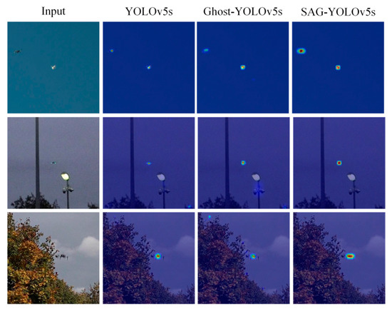 - Comparing our SAG-YOLOv5s network and YOLOv5s network, the amount of floating-point operations is reduced from 16.4 GFLOPS to 8.8 GFLOPS, which shows that our network model has lower model complexity. After combining the background difference and SAG-YOLOv5s, the detection speed when the candidate areas are 416 × 416 reaches 13.2 FPS, which is 4.2 FPS higher than before the introduction of the Ghost module;