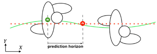The four prediction models (CV, CA, CTRV, CTRA) were then sequentially applied to the sequence starting at every sample from to , being N the length of the current trajectory data. Each sample is predicted to have a horizon of 1 s (100 samples) (see Figure 8). For this purpose, the models are applied recursively by introducing as input the output of the previous iteration until the 1-s horizon is raised.