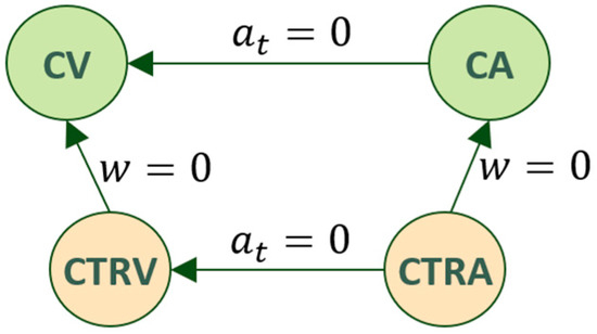 Relationship between common movement patterns defined from simplifying assumptions over the general model: CV (straight displacement at Constant Velocity), CA (straight displacement at Constant Acceleration), CTRV (curved displacement, at constant displacement and rotational velocities), and CTRA (curved displacement, at constant rotational velocity and constant accelerated displacement).