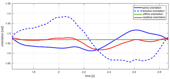 Orientation estimation (red line) and offline estimated orientation (green line). The real-time estimation is based on a proportional combination of the counter–phase signals pelvic orientation (continuous blue line) and the orientation estimated from the sampled raw spatial position of the subject (dashed blue line).