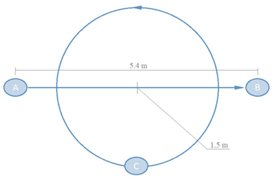Experiments involved displacements over straight (5.4 m length) and circular trajectories (1.5 m radius). Straight trajectories ran from point A to B. For curved trajectories, participants describe a circle starting and ending at point C.