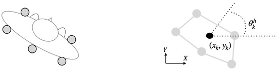 An Optitrack system composed of 10 Flex3 cameras was used to monitor the experiments with a sampling frequency of 100 Hz. Calibration of the system was performed following the recommendations of the manufacturer, and the nominal residual errors achieved were 1.4 mm (mean). Following [27] (see Figure 7), we used the bidimensional raw position of the centroid of the rigid body formed from five markers placed around the waist as the subject position. Pelvis orientation, , was estimated from the actual orientation of the rigid body from the defined reference system. A 3rd-order low-pass Butterworth filter with a cut-off frequency of 6 Hz was applied during the acquisition to remove frequential components above those pertinent for the human gait.