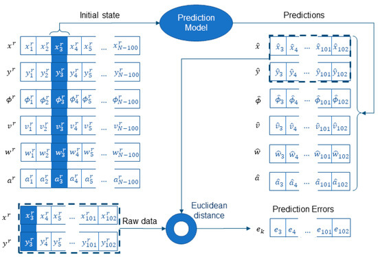 The figure describes the application of a prediction model starting at the third sample () of a raw trajectory . Predictions are sequentially extended for one second (100 samples, ) using the initial state vector highlighted in the blue column (left). The prediction error sequence is then defined from the Euclidean distance of predicted and actual positions of the subject ().