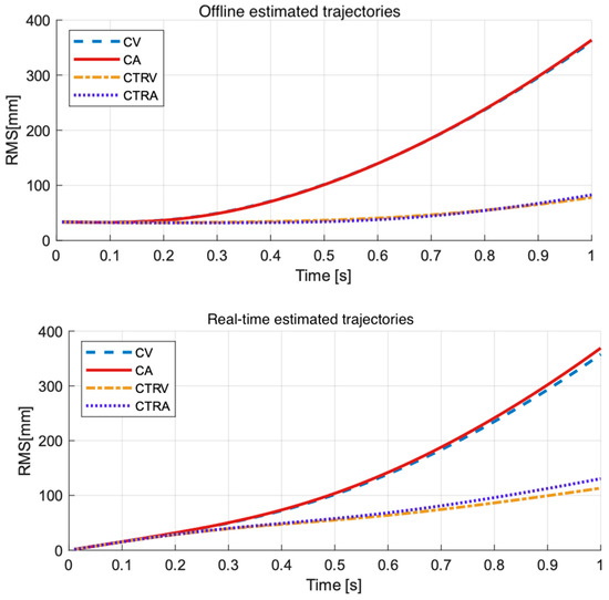 Figure 9 shows the Root Mean Square of the error sequences (predictions from one sample to one hundred samples, i.e., 0.01 s to 1 s) for each model (CV, CA, CTRV, CTRA) for the raw trajectories (top), offline estimated trajectories (centre), and real-time estimated trajectories (bottom).