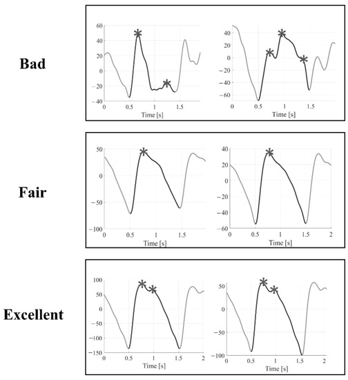 Examples of Bad, Fair, and Excellent quality pulses. Asterisks represent the local maxima for each pulse found by the Matlab findpeaks function.