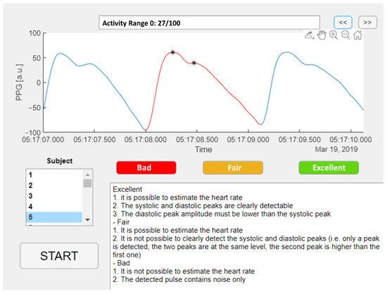 An example of the three quality levels is illustrated in Figure 2. A Matlab graphic user interface was developed to help the raters annotate the quality of the selected pulses, as shown in Figure 3. The Matlab findpeaks function was applied to highlight the local maxima of the selected pulse and help detect the systolic and diastolic peaks.