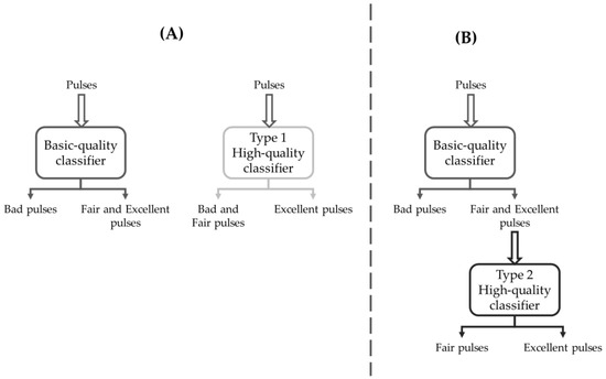 Schematic representation of the classification strategies. (A) Two independent classifiers: the Basic-quality classifier aims at detecting Fair and Excellent pulses against Bad pulses, and the Type 1 High-quality classifier aims to detect Excellent pulses against Bad and Fair pulses. (B) Cascaded classifiers, with Type 2 High-quality classifier fed with Fair and Excellent pulses selected by the Basic-quality classifier and aimed at detecting Excellent pulses against Fair pulses.