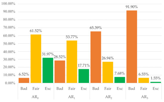 A total of 12,400 pulses were labelled by three independent raters, who agreed on 86% of the labels. Only 57 pulses (0.004%) were labelled differently by each rater and hence relegated to the B category. Overall, the inter-rater agreement was high, with a Fleiss Kappa Score of 0.84, representing perfect agreement according to Landis and Koch [49]. Using a majority voting approach, we set the final labels to train and test the classifiers: 5962 B pulses (48.08%), 4612 F pulses (37.19%), and 1826 E pulses (14.73%). The overall distribution of the three quality levels among the four activity ranges is shown in Figure 6. As expected, as the (the amount of movement) increases, the percentage of B pulses gets higher, and the percentage of F and E pulses gets lower.