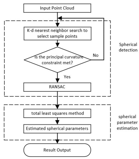 The process based on the fast, robust PC-RANSAC point cloud sphere detection algorithm is shown in Figure 2. It is divided into two parts: sphere detection and sphere parameter estimation. In spherical target detection, four random neighboring points are searched as the current sample points by the K-D nearest neighbor search algorithm. Point selection is constrained by the principal curvature of the sample point. If the condition is not satisfied, a sample point is selected again to improve the quality of the sample point. In sphere parameter estimation, it considers point cloud data coefficient matrix errors and the observation vector. The total least squares algorithm optimizes the estimation of the spherical target center coordinates.