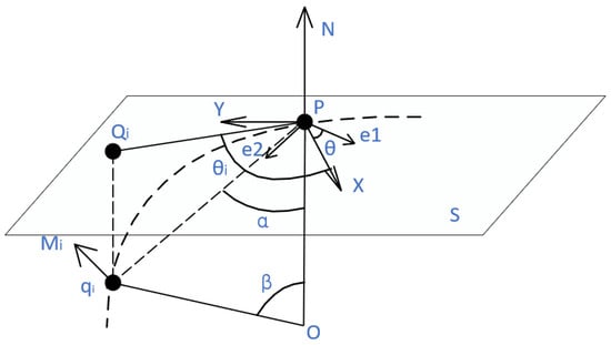 Let us assume that there are m neighboring points near P, is the ith nearest neighbor point of point P, and the normal vector of is . Let the orthogonal coordinate system be the local coordinate system L with point P as the origin, and let N denote the normal vector of point P. In L, X and Y are orthogonal unit vectors, and the coordinates of P are , those of are , and those of are . Let point P have a normal vector . Suppose that the three axes X, Y, Z are , , and , where .