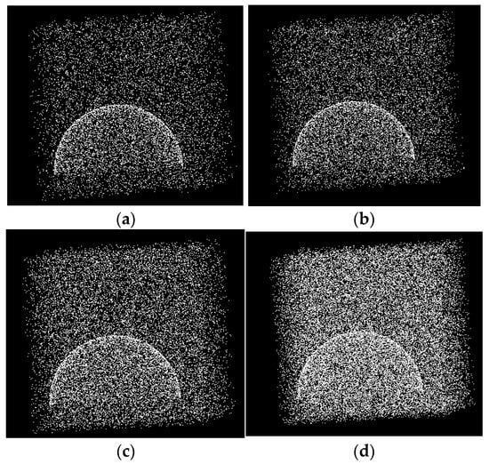 Point cloud of noisy spherical surface at different scales. (a) The proportion of the number of point clouds to noise points in the spherical model is 10%; (b) the proportion of the number of point clouds to noise points in the spherical model is 20%; (c) the proportion of the number of point clouds to noise points in the spherical model is 30%; (d) the proportion of the number of point clouds to noise points in the spherical model is 40%.