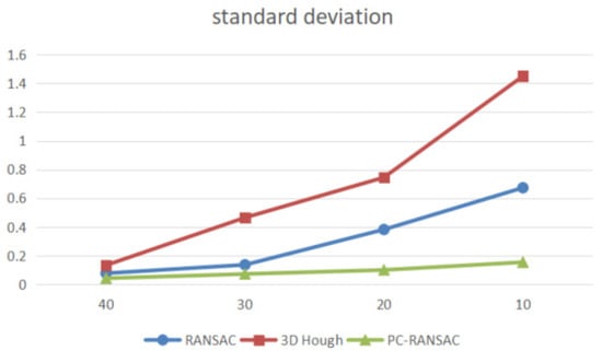 Spherical point detection was performed on the simulated point cloud data by the RANSAC algorithm, 3D Hough algorithm, and PC-RANSAC algorithm. The experimental results are given as the mean and standard deviation of the sphere center coordinates and sphere radius after repeating 20 independent experiments. In this paper, the standard deviations of the detected center coordinates and radius of the spherical model from the actual values are used to represent the accuracy of the algorithm. The standard deviation is a measurement concept of the degree of dispersion of a set of values from the mean value. The standard deviation represents the magnitude of the calculated accuracy. The standard deviation calculation formula is shown in Equation (11), and the experimental results are shown in Table 1 and Figure 5.