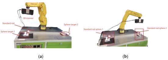 (2) The standard rod fitting was placed on the horizontal surface of the adjacent target and fixed. Standard rod sphere 1 and target 1 and standard rod sphere 2 and target 2 were each scanned by operating the 3D scanner driven by the robotic arm, as shown in the square boxed area in Figure 8b. The improved RANSAC algorithm was used to automatically detect the target sphere point cloud and standard rod sphere point cloud in the point cloud data and fit them to obtain each sphere parameter. The measured data are shown in Table 6.