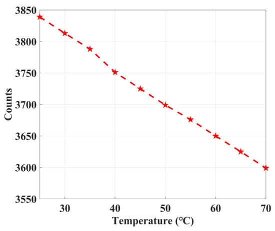 For this purpose, an innovative approach, which consists of using a frequency counter to measure the ring oscillator frequency, is adopted. When the system is working, the frequency of the ring oscillator is measured and compared with that acquired at the beginning of the measurements. As the delay changes with voltage and temperature, the frequency of the ring oscillator also varies, thus making it possible to extrapolate its effect on the delay line of the TDC and compensate for it. We count the frequency of ring oscillator at a step length of 5 °C from 25 °C to 70 °C, as Figure 11 shows. The count decreases linearly with the increase of temperature.