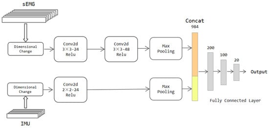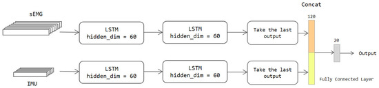 The average pooling layer of the first stream has a sliding window length of 10, and the average pooling layer of the second stream has a sliding window length of 5. After the pooling operation, the length of the sEMG data is compressed to 20. The length of the IMU data is shortened to 10. The features of these data are concatenated and input to a four-layer fully connected network to get the classification outcome.