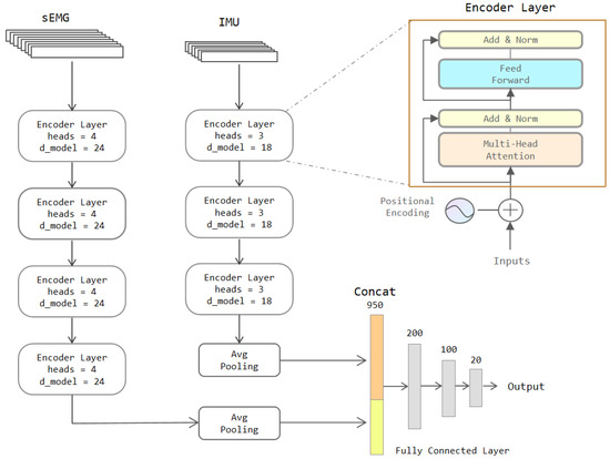 Figure 7, the sEMG data pass through 4 layers of Encoder Layers to retrieve features, followed by the average pooling layer. The average pooling layer is a 1D pooling layer with a window length of 2. That means the features are compressed to half of their original size. The IMU data also pass through 3 Encoder Layers. The features are also squeezed to half the initial size by the same pooling layer. The outputs of these two pooling layers are stitched together and fed to the three fully connected layers to output the classification results.