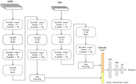 The above modifications strengthen the model’s ability to extract local features as well as increase the information contained in the global features. Given that the convolutional layer’s outbound features must be operated by Encoder Layers, temporal messages of the data cannot be destroyed. That is why we take the 1D convolution to obtain local features instead of the 2D convolution. The convolutional layer also contains a padding operation to keep the data length from changing with convolution. To avoid corrupting the location information of the features, we also use an average pooling layer instead of a maximum pooling layer. The amount of information on the features is kept to the maximum extent. The sEMG and IMU data are also input as two streams, and the specific network structure is shown in