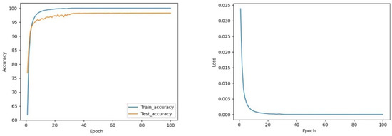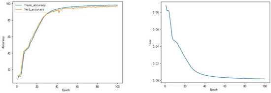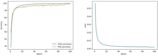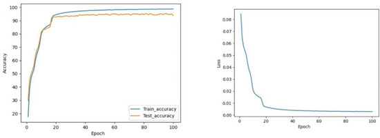 Figure 13, the CNN model maintains the test accuracy of around 94% after stabilization, and the loss value stays within 0.004. In contrast, the accuracy of the CNN-Res model is significantly raised and can be maintained above 98.13% after stabilization; moreover, the Loss value also decreases significantly after stabilization and always stays within 0.001. Finally, at the 97th epoch, its test accuracy reaches the highest value of 98.25%.