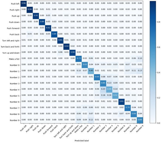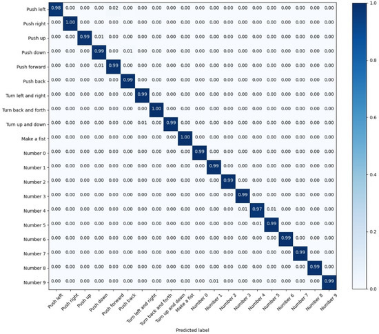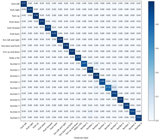 Figure 15, the recognition accuracy of ‘Number 0′, ‘Number 2′, and ‘Number 4′ is enhanced to 99%, 98%, and 96%, respectively. Furthermore, the recognition accuracies of the other 17 actions are also promoted.