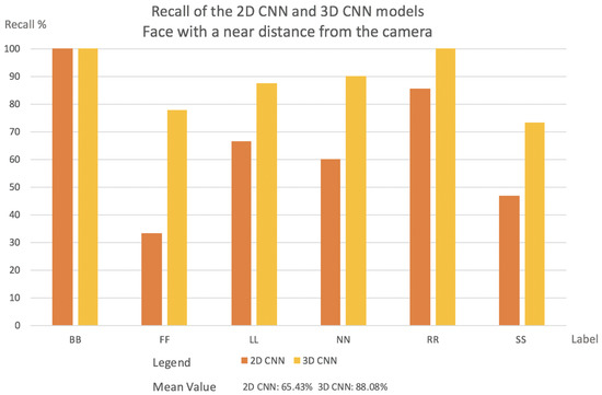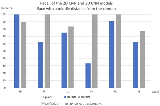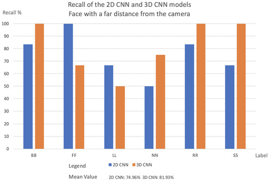 - Videos with a far face distance from the camera results: Face with a far distance position from the camera—frequently used data in other approaches—2D CNN model and 3D CNN model has more or less same Recall. The results are shown in Figure 6.