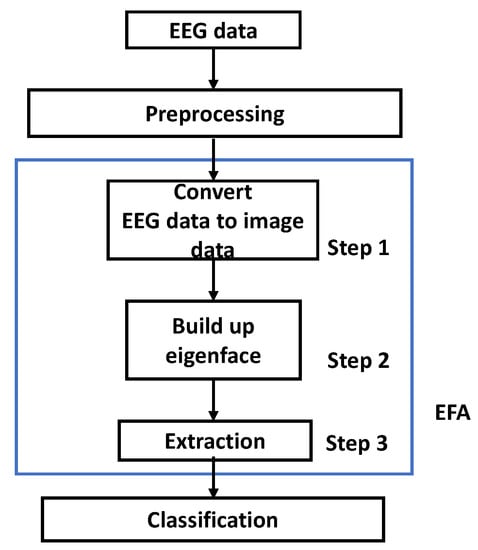 The EFA is different PCA image recognition type for dimension reduction [30]. The fundamental EFA method is depicted in Figure 3. The EEG data were preprocessed. As shown in steps 1–3, EEG data were converted to image data to build up eigenface. From eigenface, coefficients, which we called features, were extracted for training and testing procedures. Afterwards, the classes were classified for the next step.