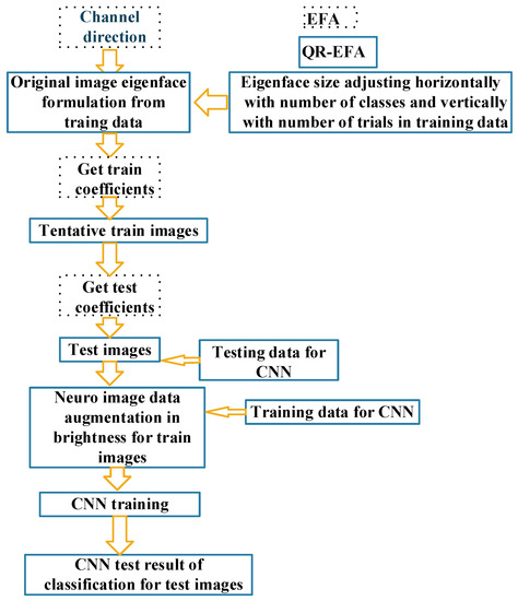 The QR-EFA method was formulated based on the previous EFA result. From egienfaces derived from the previous EFA, we will provide the description. First, the eigenface is asymmetric in horizontal and vertical directions, and the image size is excessively bigger than the size that CNN can process. Second, in BCI competition dataset, there are many discrepancies in data sizes among number of classes, trials, and subjects. Based on this fact, we proposed QR eigenface to provide a symmetrical, standardized, and sharable sizes in images. In the framework level, QR-EFA consists of the parts, such as EFA, eigenface restructuring, data augmentation, and CNN. Figure 2 shows the relationship between the previous proposed EFA and proposed QR-EFA.
