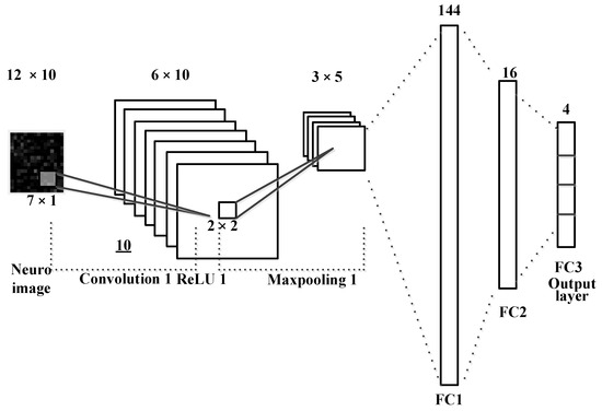 In Figure 6, a simple one convolution and mean pooling are shown to reduce a computation time and minimize the task burden. The size of input images is 12 × 10 and then it goes through a convolution layer with kernel or filter size of 7 × 1. After the layer process is done, it would be 6 × 10 output; then, it goes through 2 × 2 mean and max pooling layers. After processing a fully connected layer, we finally obtained the output with the class classification output for BCI dataset.