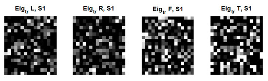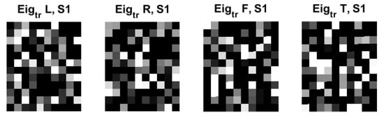Figure 7 shows the examples of eigenfaces, formulated based on the QR code. Although there are lots of QR-eigenfaces are available, we will confine only a small number of eigenfaces, considering the number of classes and trials among the subjects. We chose the eigefacecs reflecting the number of classes. We designed the first to left, second, right, the third to feet, and the last to tongue classes. However, the order is subject to change as the supervisory learning constrictions. This type of decision is related to the choice regarding the approach between the supervised and unsupervised learning.