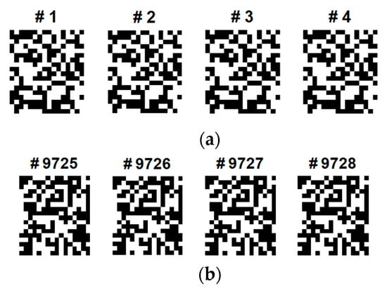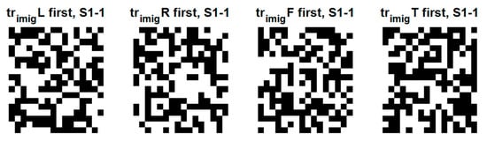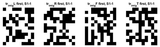 During the data augmentation process for overcoming the limited dataset problem in the BCI competition, we modified the brightness of the recovered images based on the Gaussian noise contamination equation. Although the grayscale and quantized images from the first to last appear similar, the real binary values of the images are different and unique, and they can be used for classification. Because of ML or AI paradigm considerations, a sufficiently large number of training images are needed to train CNNs and fine-tune the logic. However, as the BCI training dataset and its QR images are finite and limited, we need to amplify or diversify them by utilizing data augmentation in the brightness direction. Figure 8 shows one of the EFA QR code implementation results after the brightness data augmentation. Among four classes, considering its dominance and the activation region of the brain, we only selected and data augmented four QR training images for the left and tongue classes, as shown.