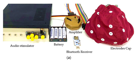 In previous research on AEP-based BCIs, as shown in Table 1, researchers mainly considered protocols and paradigms of auditory stimulation methods and the position of electrodes. Most studies have demonstrated that EEG signals obtained from the frontal, temporal, and parietal areas produce an evoked response (P300) that synchronizes with auditory tasks. For auditory stimulation, Pokorny et al. [31] provided different sound tones (low tone: 396 Hz; high tone: 1900 Hz) for the left and right sides of the stimulus using earphones to create more than a single command in the auditory BCI system. The system achieved up to 90.6% accuracy. Moreover, Cai et al. [32] implemented eight sound stimuli directions with two different short white and pink noise stimuli bursts through eight loudspeakers in an octagonal setting for a multi-command BCI. An offline experiment reported that the proposed auditory stimulus paradigm improved the results by providing higher classification results and an improved information transfer rate than conventional paradigms.