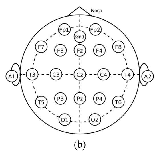 The components of the auditory BCI system (Figure 1a) consisted of an OpenBCI with an eight-channel EEG amplifier used to acquire an EEG signal using cap electrodes. Eight EEG electrodes were positioned at Fp1, Fz, Cz, T3, T4, Pz, P3, and P4, following the 10–20 system (Figure 1b) to cover the auditory cortex, frontal, and brain midline areas related to the task requirements, based on previous studies [31,32,33,34]. The reference electrode was at the A1 position. The EEGs were recorded at a sampling rate of 256 Hz using the OpenBCI software. The audio stimulator with speakers was connected to the OpenBCI system for marking the EEG with different sound stimuli. MATLAB (MathWorks) [ver. R2019a] was used to process and analyze the recorded EEG signals from each subject. A 50 Hz notch filter was used to remove power line noises, and a 0.1 Hz to 30 Hz bandpass digital filter was used for motion artifact removal via the EEGLAB toolbox [40]. Subsequently, we employed the ERPLAB toolbox to segment EEG signals and detect ERP responses [41].