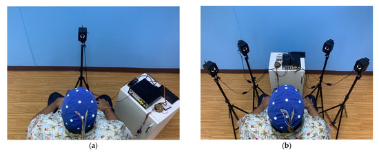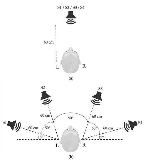 Two patterns of the loudspeaker position settings for auditory stimulation. (a) Single-loudspeaker position setting. (b) Four loudspeaker position settings in front of the participant.
