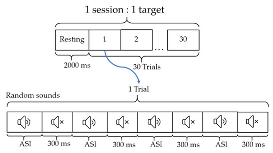 The experimental setup is illustrated in Figure 3. The paradigm is set to start in a resting state for baseline collection at 2000 ms. A single session consisting of 30 trials of an auditory stream stimulus with two ASI, that is, 100 ms and 250 ms, was used for verification. Subsequently, the sound was muted for 300 ms. Each trial consisted of four random stimulus sounds. The participant performed only the target sounds following the sequence in Table 3 for vowel sounds and Table 4 for numeral sounds as 12 targets (sessions) for three rounds per sound (vowel and numeral) with two proposed auditory stimulation patterns (single and multi-loudspeaker). Before proceeding to the new round, participants were allowed to rest for 5 min.