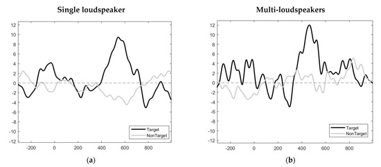 Before using the sound of numerals, we had to observe ERP features by creating the grand-averaged EPR for visualization using the EEGLAB toolbox, as shown in Figure 5. The black lines show the target responses, and the gray lines show the non-target responses. We can demonstrate filtered EEG data obtained from the subject showing a clear P300 in the black plot that occurred approximately 400 ms after the onset of the stimuli. Peaks can be observed at approximately 200 ms and 500 ms for one speaker and multiple speakers, respectively. The results revealed that the ERP components were similar to those of the previous auditory ERP-based BCI.