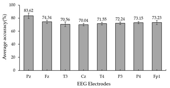 According to Figure 6, we selected the Cz, Fz, and Pz electrodes to obtain additional responses from parietal cortices known to generate ERPs related to spatial and P300 responses. This figure presents the verification of the electrodes for ERP detection. The maximum average accuracy of the electrode was 83.62% for Pz. We observed that the EEG from channel Pz exhibited a positive peak for the target sound. We can observe a grand−averaged ERP in Figure 5. This channel was used to create parameters for classification using a minimum N200 response combined with a maximum P300 response.
