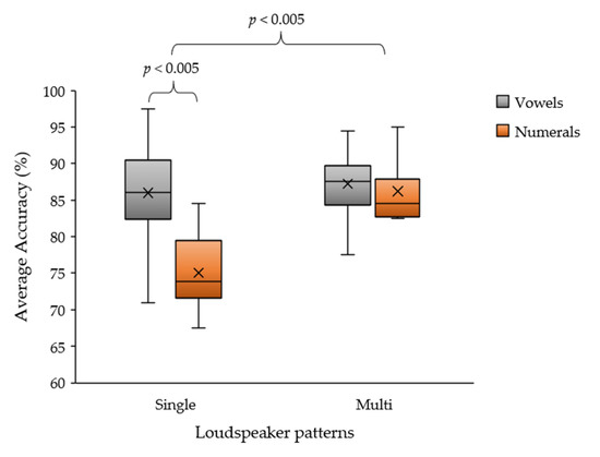 Results of the average classification accuracy under different loudspeaker patterns of vowel and numeral stimuli for each participant.