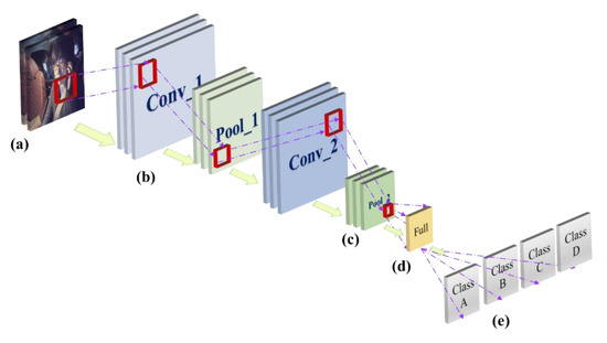 Convolutional neural network architecture: (a) input layer; (b) convolutional layer; (c) pooling layer; (d) fully connected layer; (e) classification layer.