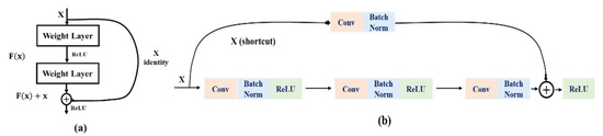 ResNet [18] is a class of networks designed to solve the gradient explosion and the overfitting problems during the model-training phase as the network deepens. The purpose of the residual module (Figure 2a) is to add the features extracted from the front to back layers of the model, and by using the shortcut connection (Figure 2b), ResNet effectively solves the problems of network gradient explosion and overfitting during the training process. At the same time, by introducing the batch-normalization (BN) layers, ResNet speeds up the network training speed and convergence stability. Due to the application advantages of the ResNet, this experiment selects a different-depth ResNet as the guiding architecture to complete the risky-driving-image-classification tasks.